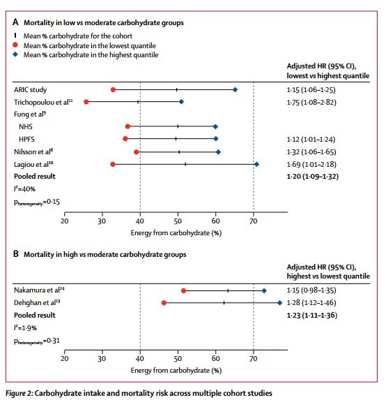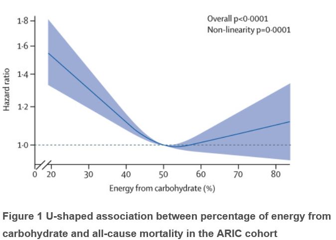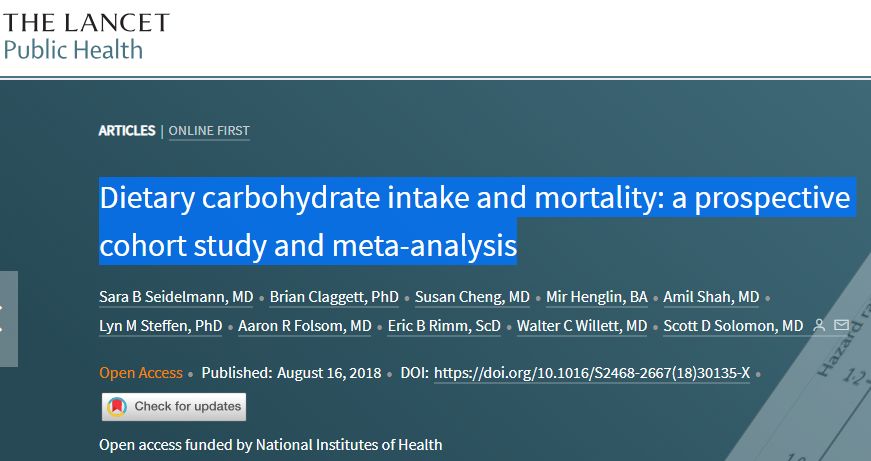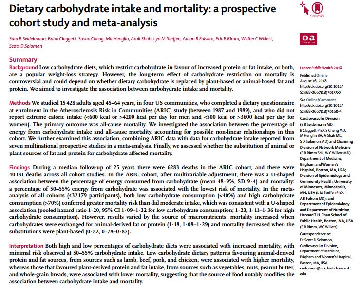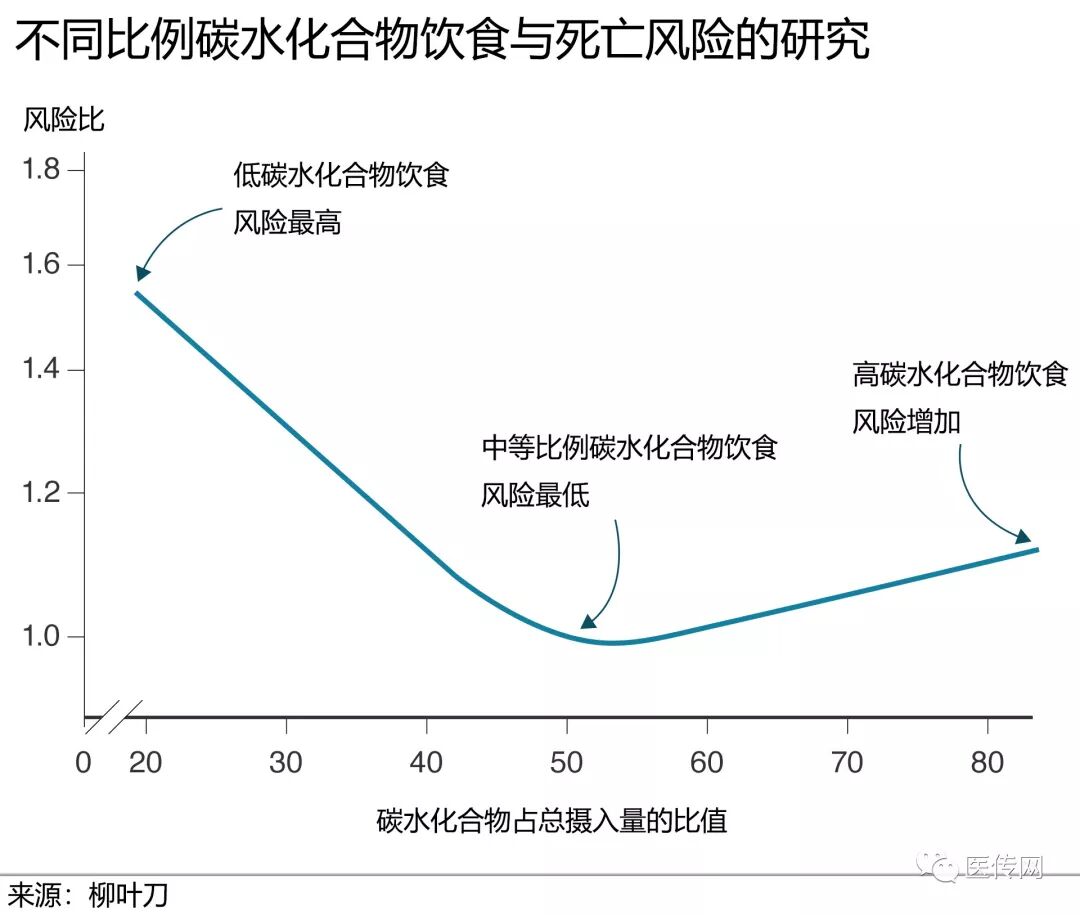 2018年8月16日,全球最权威的医学期刊《柳叶刀》子刊《柳叶刀公共卫生》(The Lancet Public Health)发表了一项研究,表明低碳水化合物饮食可以将预期寿命缩短长达4年。低碳水化合物饮食,它曾一度被认为有利于体重减轻,改善心脏代谢风险。但长达25年,超过43万人的研究表明:低碳水化合物饮食会缩减寿命。 碳水化合物,简单来说就是各种糖类,它们的主要来源是淀粉类食物,如土豆,面包,大米,面粉和谷物等,同时也包括蔬菜,水果。 低碳水化合物饮食,是目前较为流行的一种减肥策略,如阿特金斯等减肥法,已经越来越受到减肥者的欢迎,但是,美国这项25年来研究表明,适度摄入碳水化合物,而非低碳水化合物饮食 ,更为健康。 研究是由美国波士顿布莱根妇女医院的Scott D Solomon博士和其研究团队共同完成。研究者们把美国四个社区的不同社会经济背景的15,428名45-64岁成年人纳入了社区动脉粥样硬化风险(ARIC)队列研究,让其填写了有关他们所食用的食物和饮料的问卷,以及份量,随访25年,科学家们评估了他们从碳水化合物,脂肪和蛋白质中获得的卡路里比例。而后,研究人员结合了来自北美,欧洲和亚洲国家的432,179人的数据的8个前瞻性队列进行了荟萃分析。 研究结果表明: 在跟踪该组平均25年后,研究人员发现,中等剂量的碳水化合物饮食(从碳水化合物中获得50-55%能量的人,中等碳水化合物组,也符合中国居民膳食指南的建议)与低剂量相比,其死亡风险大幅降低,和高碳水化合物组相比也略低。结论:总体碳水化合物摄入量和预期寿命之间存在着U形关联。 翻译解释图片如下: 研究人员估计,从50岁起,中度碳水化合物组的人平均预计可以再活33年。 然而: