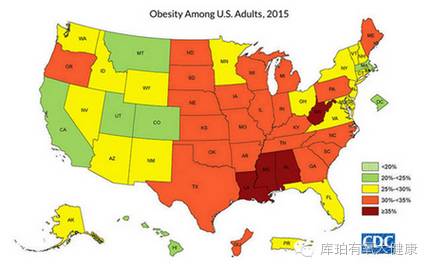 该图为美国2015年各州肥胖人口的分布情况。和中国南方人瘦,北方人胖正好相反,美国是南方各州胖子最多(深红色块表明该州成年人的肥胖率已经高达35%!)
