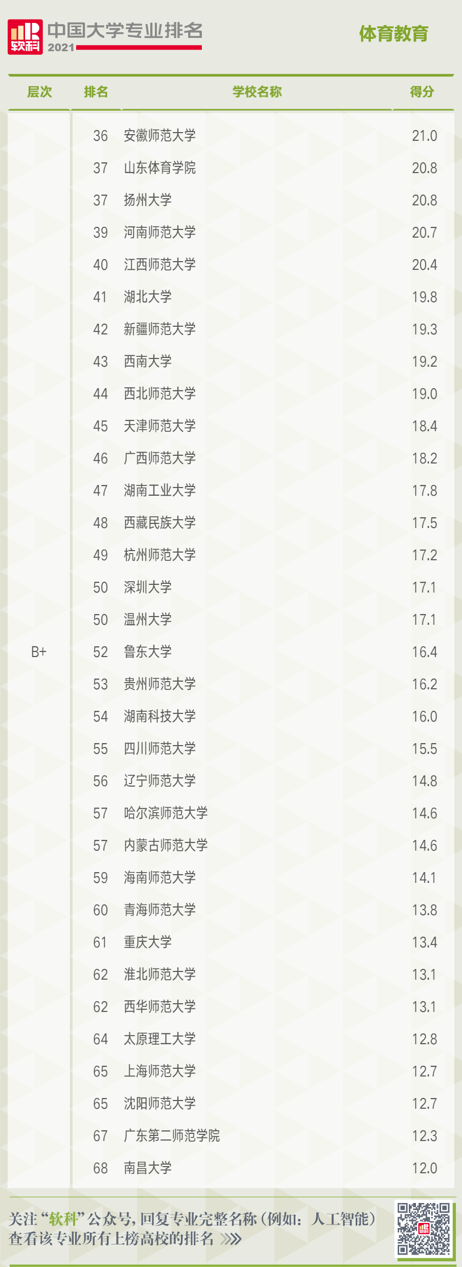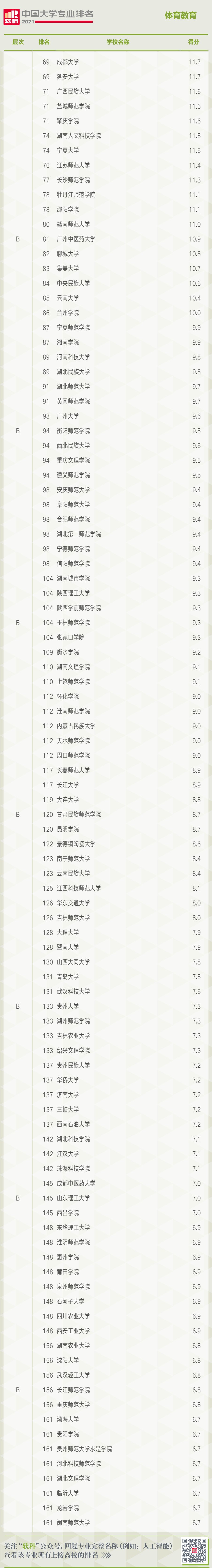 体育教育专业排名中,共有178高校上,A+层次的高校依次为北京体育大学、上海体育学院、华东师范大学、北京师范大学、福建师范大学、华南师范大学