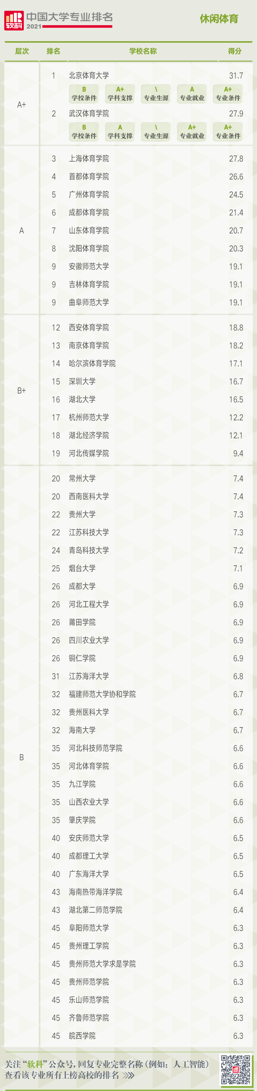 在休闲体育专业排名中,共有51所高校上榜,A+层次的高校依次为北京体育大学、武汉体育学院。