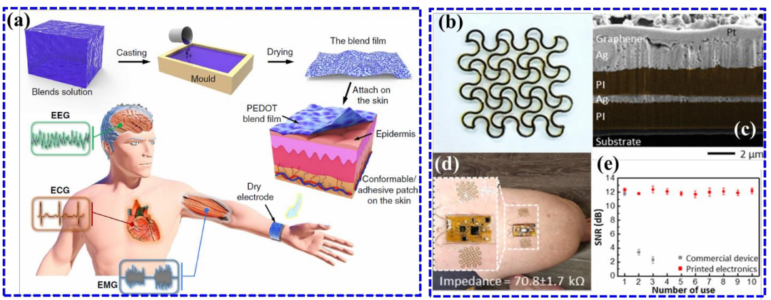 国家体育总局体育科学研究所/暨南大学/北京体育大学苏炳添副教授(第一作者)、国家体育总局体育科学研究所/北京体育大学陈小平特聘研究员、暨南大学化学与材料学院李风煜教授合作,从运动员训练中对各种体征信号采集、分析的需求出发,综述了近些年来柔性电子、光电集成传感器的最新研究进展,介绍了不同种类的运动信号检测方法,包括生物电位信号监测、电化学传感监测、光电容积描记法监测等。为我国运动员与体育工作者提供最新、最前沿的可穿戴传感器技术总结,为制定更为精准、可量化的科学训练方法与理论提供知识与技术支持,推动我国“体育强国建设”。相关论文以“科学训练辅助:柔性可穿戴传感器运动监测应用”为题,发表在《中国科学: 信息科学》上。 1 引言 百米短跑被誉为竞技体育“皇冠上的宝石”, 是国家在体育发展水平的核心竞争力. 近几年我国以刘翔、笔者苏炳添等为代表的运动员在短跑竞技中不断取得突破, 在引进发达国家先进训练理念的同时, 系统性的引进 Freelap 计时系统、Keiser 力量训练、BSXinsigh、肌氧监测、Polar 心率监测、Cosmed 气体代 谢监测等先进的可穿戴式训练分析、评估仪器. 通过内部的传感器实时检测和反馈人体活动,对肌肉发力、 速度、身体协调性等训练效果进行评估,同时对呼吸、心率、肌氧、血乳酸等体征信息进行量化的实时监测与分析, 监测运动员疲劳度, 防止训练损伤, 制定科学的体能恢复与训练计划. 生化传感主要是监测生物化学信号比如神经信号、化学物质等[1-3], 并将其转化为可分析数字化信号. 运动传感是监测人的体表微 动或全身运动, 比如脉搏跳动、心率、关节活动、肌肉活动等[4-8], 并将其转化为电信号等数据化信息. 可穿 戴传感器是决定当前智能设备功能的关键单元[9-13]. 短跑运动员在后程跑的训练中(后程降速问题是目前 我国短跑相比于世界顶级运动员的关键短板), 需要针对 80-90 米处的步长、步频、触地时间、爆发力进 行精细定量分析的同时, 更需要对运动员的呼吸、血乳酸、肌电等生物体征信号进行全程实时纪录与分析. 现有的基于视频技术的动作分析在发力、体征监测方面无法进行量化分析, 而目前的爆发力、呼吸、乳酸、 血氧饱和度、肌电等体征监测设备佩戴舒适性差、灵敏度低, 无法实时监测运动员自由状态下的体征信息, 也无法获取准确信息, 从而严重影响训练效果. 研究调查表明, 可穿戴市场份额每年能到达 350 亿美元. 随着市场不断扩大, 预计 2020 年我国的可穿 戴传感器设备市场将达到 767.4 亿元. 然而, 根据上海体育学院与美国运动医学学会共同发布的《2019 中国健身趋势》发现[14-15], 可穿戴设备关注度明显下降, 原因主要是:1)市场同类产品多, 但功能单一;2) 市场推广的可穿戴设备材料多为硬性材料, 佩戴舒适性差;3)现有可穿戴设备的检测灵敏度、准确性不高, 不能给出体征关联性等更深层的体征信息. 随着柔性电子、微加工封装技术、大数据人工智能等新技术的 巨大进步, 柔性可穿戴传感设备获得了极大促进与蓬勃发展. 传感器逐渐向微型化、集成化、智能化、多元 化的方向发展. 在运动过程中, 人体会产生各种类型的运动生理信号. 常见的运动生理信号包括运动生物姿态信号、 电生理信号、分子标记的生物化学信号、生物组织动力学信号等[16]. 不同类型的信号蕴含着特定的生理特 征与身体信息, 通过对这些信号的实时监测, 实现运动员的训练效果与身体状况客观的评价. 本文针对运 动监测特别是竞技训练辅助的巨大需求, 通过总结近年来可穿戴柔性传感器相关的新技术, 及其在电生理(Electrophysiology)[17]、光电感知(Photoelectric sensing)[18]、生物分子(Biochemical molecule)[19]等信 号检测分析的应用. 另外, 还概述国内外柔性可穿戴传感器在生理信号监测的应用最新研究进展, 针对目 前运动员还无法同时进行多项生理指标的监测, 提出目前学术界的最新解决方案, 为相关科研技术转化成 产业化提供相应的指导建议, 促进科研成果的转化(如图 1). 另外, 为运动员制定更为科学、详细的训练 计划, 提供合理的技术指导, 推进运动辅助系统不断完善, 通过实时监控运动生理信号, 从而实现运动员 训练水平提高[20]. 图 1. 基于不同传感、分析原理设计的传感器,针对运动生理信号进行运动监测与科学分析. (a) 多功能表皮电子测试系统(EES)可检测多种电生理信号, [21] (b) 聚合物电极可附着测试心电(ECG)、肌电(EMG)信号, [22] (c) 光电容积描(PPG) 用于心率检测, [23] (d) 有机光电二极管可以用作光电血氧计, [24] (e) 微流体电极进行汗液电化学传感器监测, [25] (f) 集成的 电化学传感绷带可实现实时、多底物的汗液分析, [26] (g) 在运动期间,汗液收集贴片用于连续汗液监测,[27] (h) 可穿戴电化 学平台用于生理指标监测[28]. 2 运动信号类型 高水平运动员能够取得优异的成绩, 主要取决于:首先, 制定及完善科学的训练方案, 设立专业的训练 团队, 根据高水平运动员个体的身体特征、体能状况, 及时调整自身训练方案;其次, 基于完整及科学化的 训练监测设备, 对运动员的生理指标进行分析, 纠正运动姿态, 制定合理训练计划, 判定个人对训练的适 应性与不良反应等, 最大限度地避免疲劳受伤的发生, 从而提高运动员整体的竞技水平[29]. 通过对运动过 