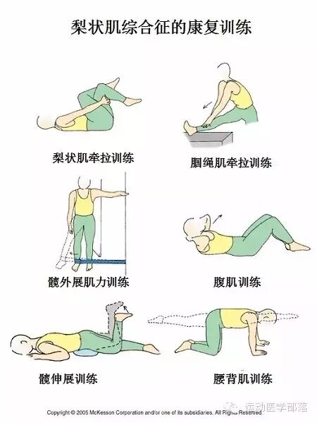 康复训练的指导原则:降低梨状肌的张力,改善相关肌群的肌力不平衡,纠正相关的生物力学改变。