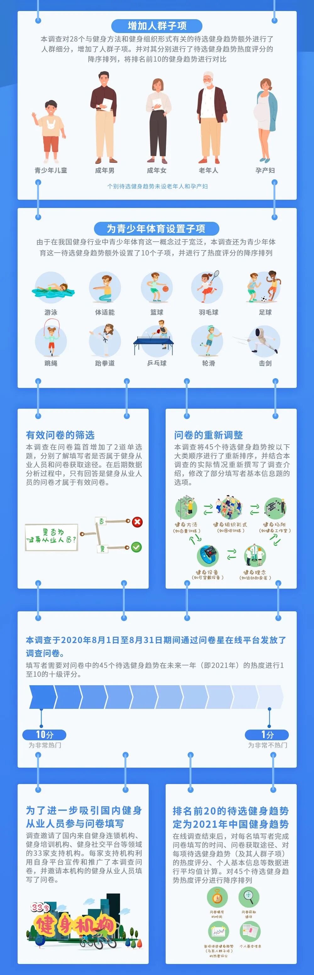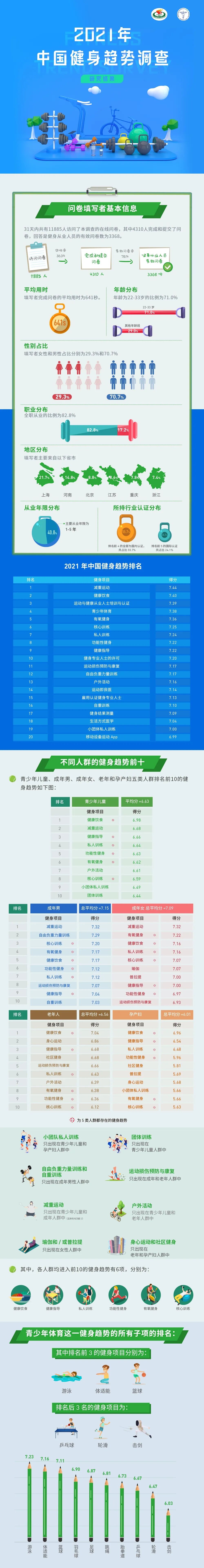 12月28日,上海体育学院发布《2021年中国健身趋势》。上海体育学院党委书记李崟、国家体育总局体育科学研究所所长和中国体育科学学会副理事长兼秘书长冯连世、上海市体育局一级巡视员赵光圣、上海市卫健委健康促进处处长王彤、上海市体育场馆设施管理中心副主任黄海松、美国运动医学学会前主席Walter Thompson和Barbara Ainsworth、18家健身机构的23名代表参加了发布会。发布会由上海体育学院体育教育训练学院院长高炳宏主持。 ![]() 李崟首先致辞。其表示,上海体育学院自2017年起与美国运动医学学会合作开展中国健身趋势调查,先后发布了2018年、2019年和2020年《中国健身趋势》,受到了国内健身行业的广泛关注。2021年将是我国由全面小康迈向全面健康的开局之年,对国内健身趋势的预测是上海体育学院服务“健康中国”和“体育强国”建设的一个重要体现。“十四五”期间,上海体育学院将积极推进体教融合、体医融合、产教融合和交叉学科融合,以社区健康师为抓手积极发挥体育高等院校在人才培养、科学研究和社会服务三方面的作用。 黎涌明代表课题组公布了2021年中国健身趋势调查结果。2021年排名前20的中国健身趋势分别为减重运动、健康饮食、运动与健康从业人士培训与认证、青少年体育、有氧健身、核心训练、私人训练、功能性健身、健康指导、健身专业人士的许可、运动损伤预防与康复、自由负重力量训练、户外活动、运动即良医、雇用认证健身专业人士、自重训练、健身结果测量、生活方式医学、小团体私人训练、移动设备运动App。 调查结果表明,减重运动高居榜首;有氧健身、健康指导、生活方式医学、运动与健康从业人士培训与认证为新兴健身趋势;排名前5的青少年体育子项分别为游泳、体适能、篮球、羽毛球和足球。不同人群的健身趋势存在共性与区别,相同的健身趋势为健康饮食、健康指导、私人训练、功能性健身、有氧健身和核心训练。减重运动只出现在青少年儿童和成年人群中,户外活动只出现在青少年儿童和老年人群中,小团队私人训练只出现在青少年儿童和孕产妇人群中,团体训练只出现在青少年儿童人群中,自由负重力量训练和自重训练只出现在成年男性人群中,运动损伤预防与康复只出现在成年和老年人群中,瑜伽和/或普拉提只出现在女性人群中,身心运动和社区健身只出现在老年和孕产妇人群中。 与会专家对2021年中国健身趋势的调查结果进行了点评。冯连世认为,健身行业是体医融合的重要阵地,对健身趋势的预测将有助于提高体医融合的针对性和有效性。赵光圣表示,中国健身趋势调查的结果将为政府部门贯彻落实习近平总书记“人民城市人民建,人民城市为人民”重要理念提供重要参考。王彤强调,中国健身趋势调查的结果验证了我国新冠疫情的成功应对,科学健身未来将在我国卫生健康事业中发挥更加积极的作用。 本年度调查得到了金吉鸟健身、一兆韦德、巅峰减重等33家健身连锁机构、健身培养机构和健身社交平台的支持,发布会期间赵光圣和王彤分别为支持机构和特殊贡献机构颁发了证书。 发布会期间,Walter Thompson代表美国运动医学学会也公布了2021年全球健身趋势调查结果。2021年排名前20的全球健身趋势分别为在线训练、可穿戴设备、自重训练、户外活动、高强度间歇训练、虚拟现实健身训练、运动即良医、自由负重力量训练、老年人健身计划、私人训练、健康指导、移动设备运动App、雇用认证健身专业人士、功能性健身、瑜伽、减重运动、团体训练、生活方式医学、健身专业人士的许可、灵活性和肌筋膜设备。 近年来,上海体育学院成功申报了体能训练、运动能力开发两个本科专业,启动了运动促进健康的体医复合型人才的培养工作,依托“社区健康师”,整合校内专家资源深入社区,指导社区居民“如何吃、如何动、如何防、如何调”,以国家和社会需求为导向完善人才招生和培养。 中国健身趋势调查是上海体育学院和美国运动医学学会联合开展的调查,该调查旨在通过在线问卷的方式询问国内健身行业的从业人员来预测未来一年的中国健身趋势,为国内健身相关的企业、俱乐部、高校、医疗机构调整未来一年的课程设置、人才培养、设备研发提供参考。 2021中国健身趋势TOP20 ![]() ![]() 2021全球健身趋势TOP20 ![]() ![]() 2021中国健身趋势研究方法 ![]() 2021中国健身趋势调查研究结果 文字:黎涌明 报送单位:体育教育训练学院 责任编辑:黄勇、刘思琪 ![]() |